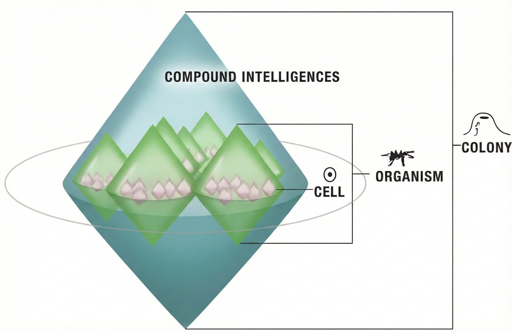 The colony pursues goals no individual ant could even conceive. Maintain supply routes across territory. Shift labor allocation based on need. Defend against coordinated attacks. Relocate the entire nest. Goals across territory and seasons. Again, the cognitive light cone expanded - not from smarter ants, but from coordination.