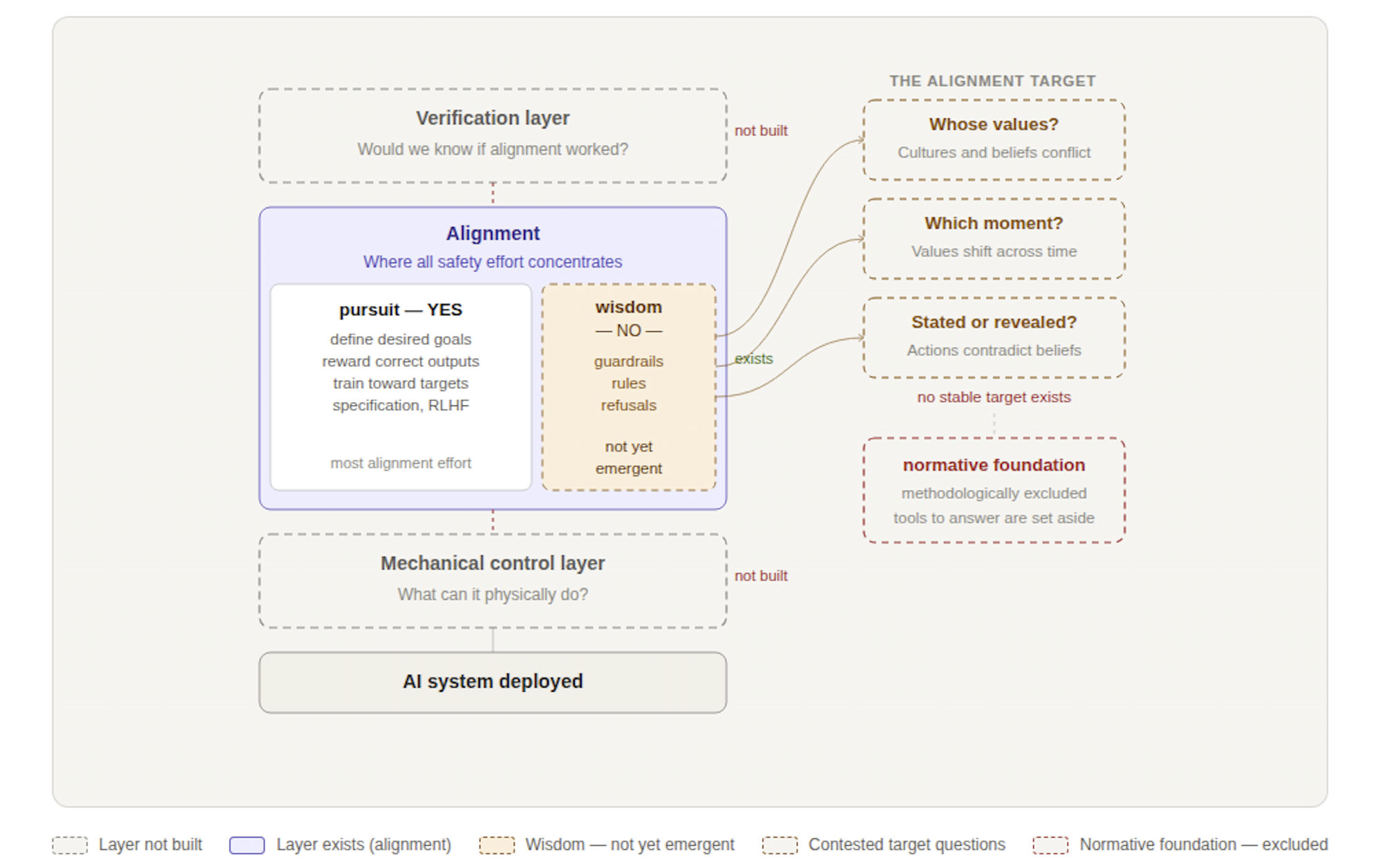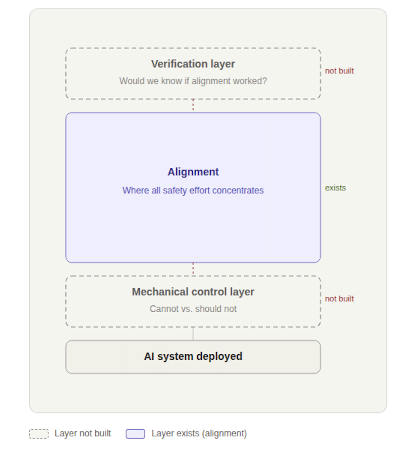 Above it, the verification layer - the ability to confirm whether alignment is actually operative - has not been built.
